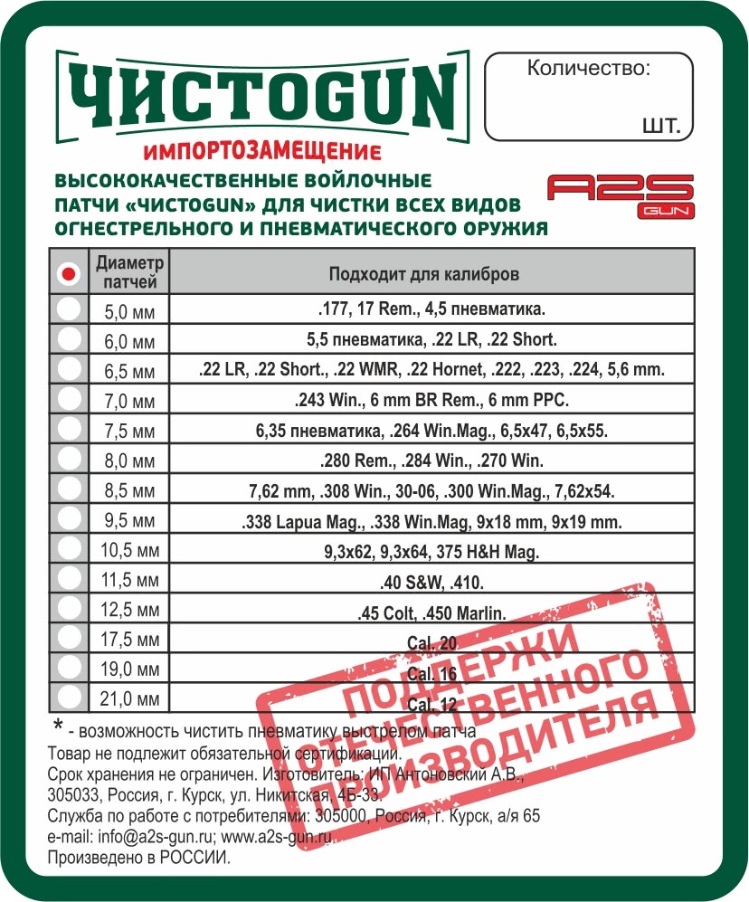 Войлочными патчами хорошо смачивать ствол, так же чистить и полировать ствол с помощью пасты. Войлочными патчами удобно чистить патронник.Войлочные патчи сразу готовы к работе (не нужно ничего резать из подручных материалов). Войлочный патч полностью копирует геометрию нарезов, что позволяет ему безупречно вычищать канал ствола. Наилучшее сочетание высоких абсорбирующих и чистящих свойств. Идеально точный и постоянный диаметр. Вы можете регулировать плотность прохода войлочного патча при помощи резьбовой адаптер-иголки, как до, так и во время нахождения патча в канале ствола.