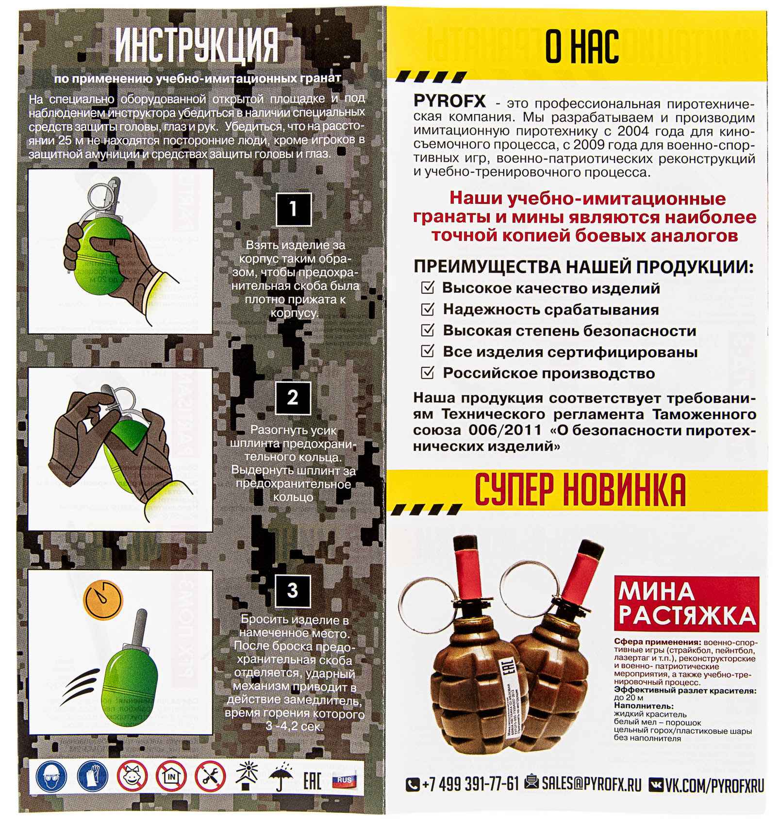 Пиротехнические учебно-имитационные гранаты PFX F1 Dust по своему принципу инициации и работы являются нелетальными аналогами российских боевых гранат Ф-1, предназначены для создания мощного акустического эффекта, облака белого пылевого пигмента и отработки навыка применения ручных боевых гранат.Характеристики