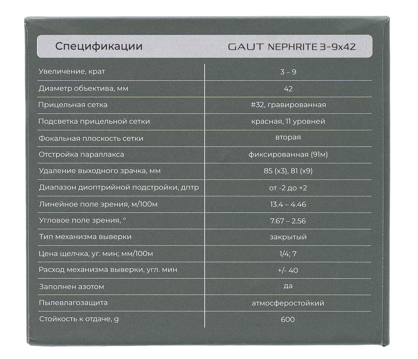 Gaut Nephrite 3-9x42 – это оптический прицел с переменной кратностью, предназначенный для охоты и спортивной стрельбы на средние дистанции. Он оснащен простой и эффективной прицельной сеткой типа “32” с красной подсветкой точки (11 уровней яркости), обеспечивает четкое и контрастное изображение, а также надежную работу в различных условиях.
